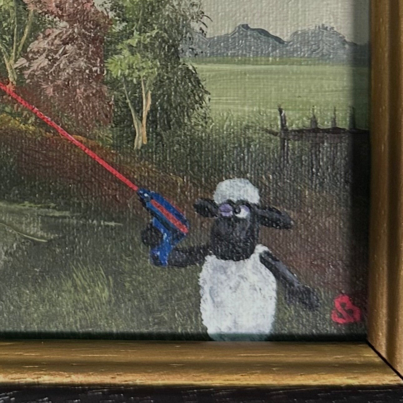 Kringloopschilderij omgetoverd tot mixed media ode: Shaun the Sheep in een nieuwe setting vol knipoog. Met een echt weggebrand gat in de lijst! Verder is dit landschapje helemaal opgefrist en met het extra vernislaagje straalt dit werk weer als nooit tevoren.