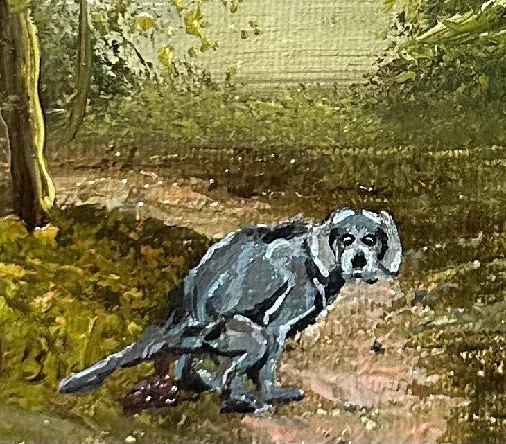 In het bos gebeurt meer dan je denkt… deze hond laat zijn sporen achter! Met een opgefriste lijst en een extra vernislaagje krijgt dit alledaagse tafereel een speelse knipoog én een nieuw verhaal